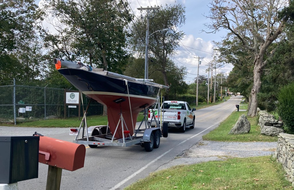 The second is a photo of Grace, our Shields, heading to Massachusetts last week with my partner Reed Baer at the helm of the U-Haul truck. Reed sailed with me in the IOD event—and now we both know it’s time for us to reset, remembering that past performance is no guarantee of future…(etc., etc.). Our intention is to sail with our Grace teammates as well as we know how, adapt to the inevitable changes in the wind and our fortunes, and have fun as we go—hoping that our race results will again allow us to be in the hunt when the final day of the Shields Nationals dawns next Saturday.